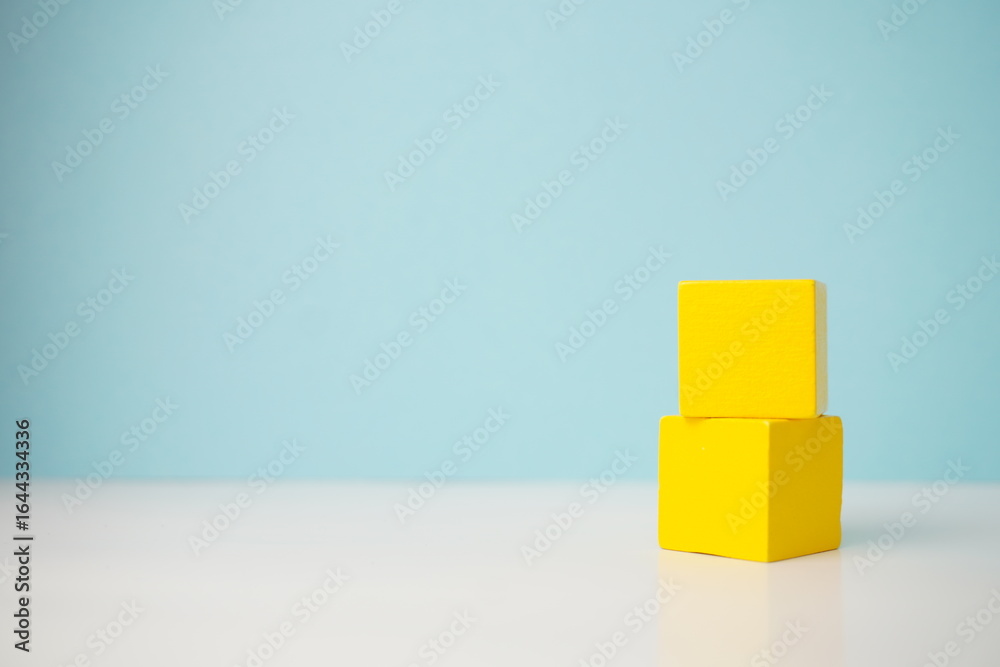 Yellow wooden blocks stacked on a white surface with a blue background for creative concept illustration, versatile wooden cubes on clean background for business, health and education concepts.
