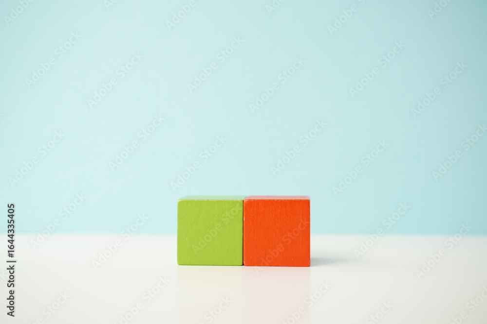 Two solid wooden blocks in contrasting green and orange colors on a light backdrop, versatile wooden cubes on clean background for business, health and education concepts.