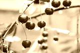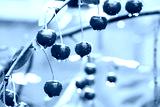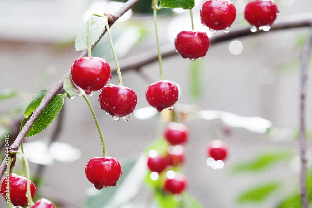 Beautiful cherries branch after rain. Red berry fruit tree with raindrops, summer time garden background. Selective focus. Beautiful bokeh photo.