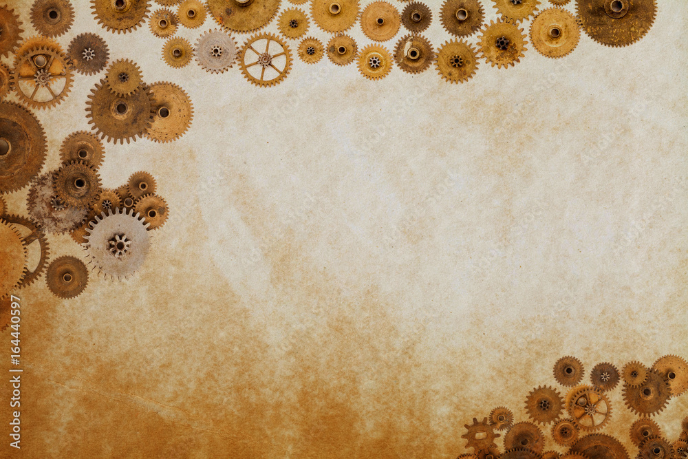 Industrial machinery template, cogs gears on aged textured paper manuscript. Steampunk ornament vintage paper sheet