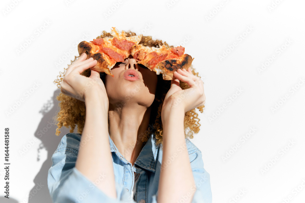 Woman with curly hair playfully holding pizza slice against white background, expressing joy and love for food, showcasing a vibrant lifestyle