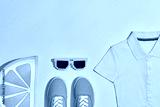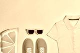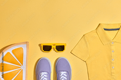 Summer Hipster Girl Accessories Set. Fashion Design. Hot Summer Sunny Vibes. Glamor Orange Citrus Clutch, Trendy Sneakers, fashion Sunglasses on Yellow. Sweet Style. Vanilla Pastel Color.Minimal, Art