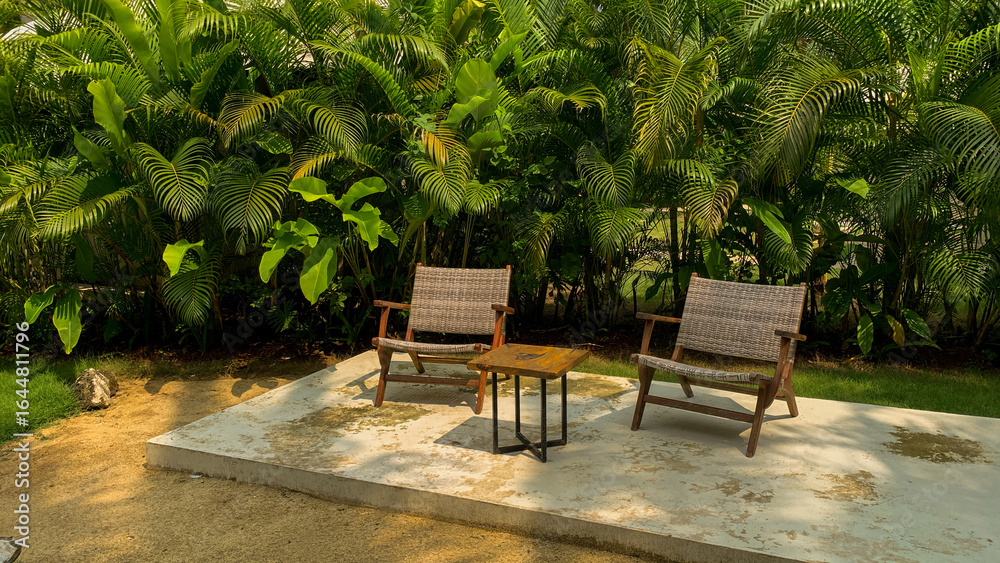 Two beach chairs made of wood and rattan and a small square table made of wood with outdoor iron poles, placed outside the beach hotel garden with green palm plants. copy space concept. vacation.