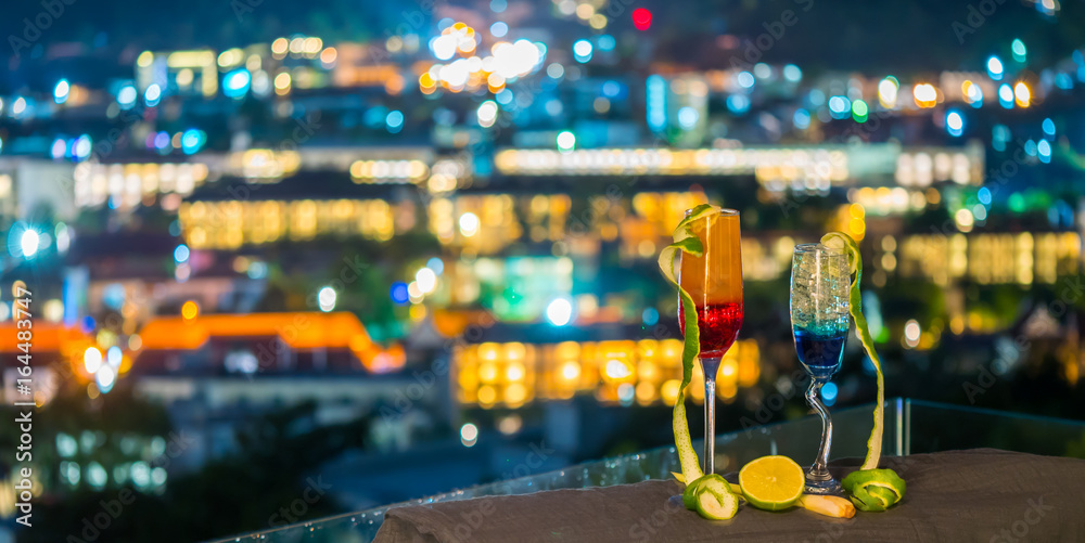 Two glass of cocktail and lemon with bokeh background from city light in christmas or new year party concept .