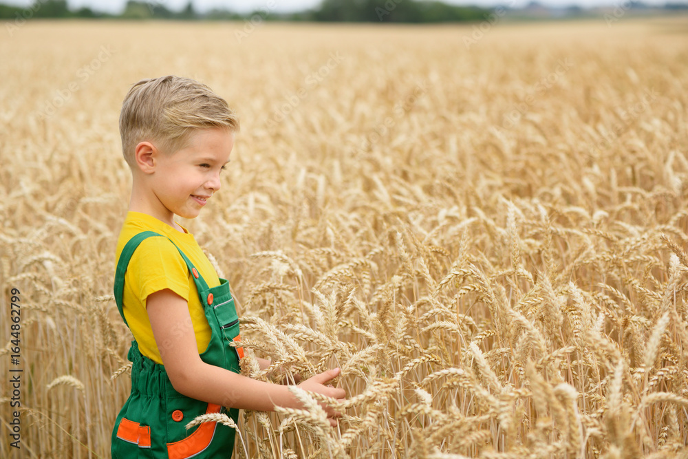Uśmiechnięty chłopiec w stroju farmerskim stoi na polu dojrzałego zboża.