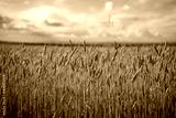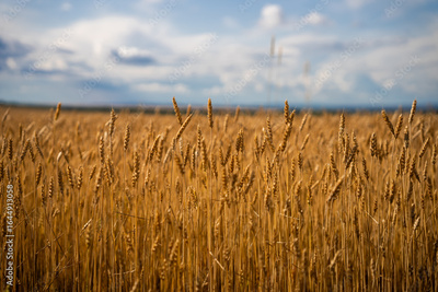 Golden wheat field under a blue sky with clouds.