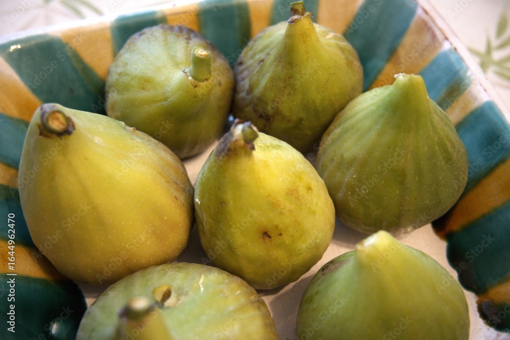 Close-up of ripe figs served on a vibrant decorative plate placed on a table, showcasing their rich colors and textures.