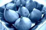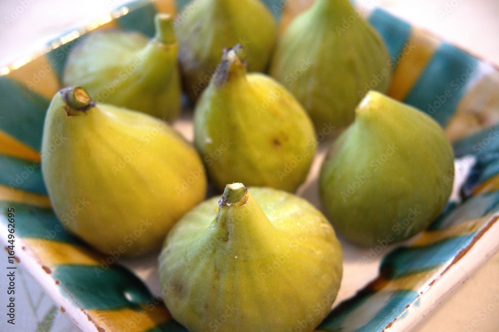 Close-up of ripe figs served on a vibrant decorative plate placed on a table, showcasing their rich colors and textures.