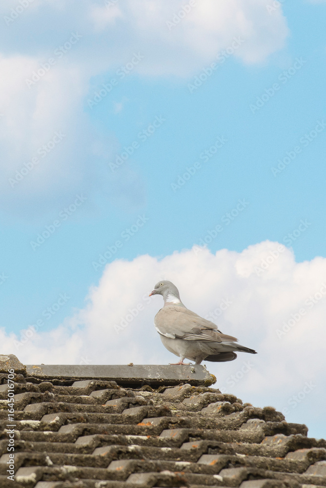 Gray bird perched on a textured rooftop against a bright blue sky with fluffy clouds