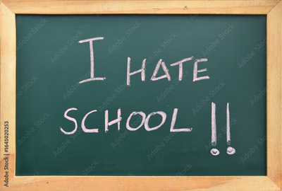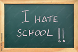 I hate school. Neurodivergence and anxiety in school children. Struggling to go to school. Handwritten sign with exclamation points in pink chalk, on blackboard with wood frame. Unsuccessful student.
