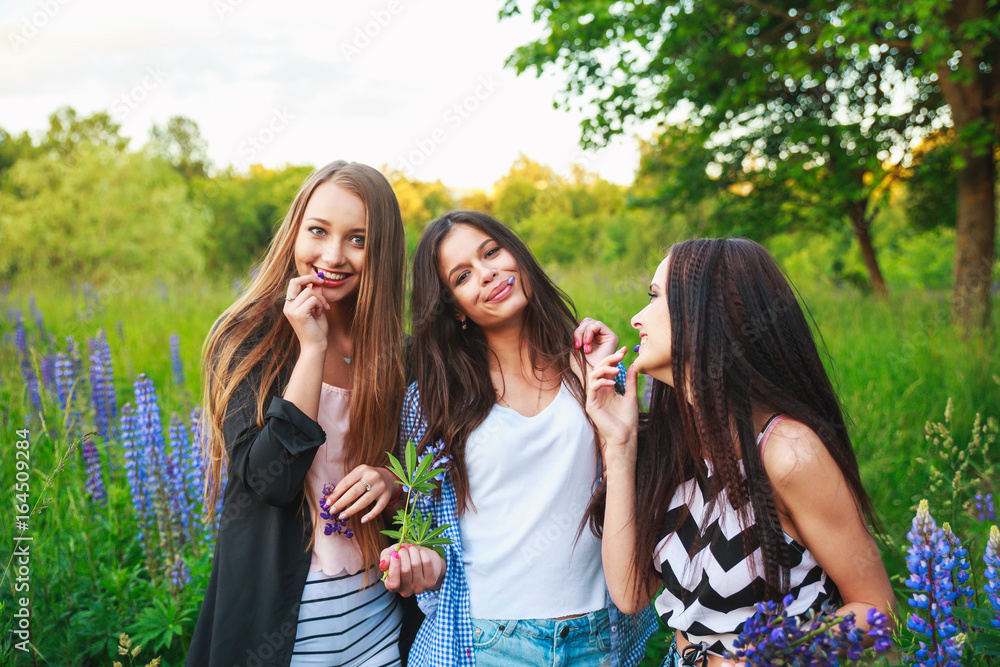 Portrait of happy smiling friends on weekend outdoor. Three beautiful young happy girls best friends having fun, smiling and laughing.