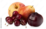 fresh fruit assortment, apple, pear, plums, and cherries.