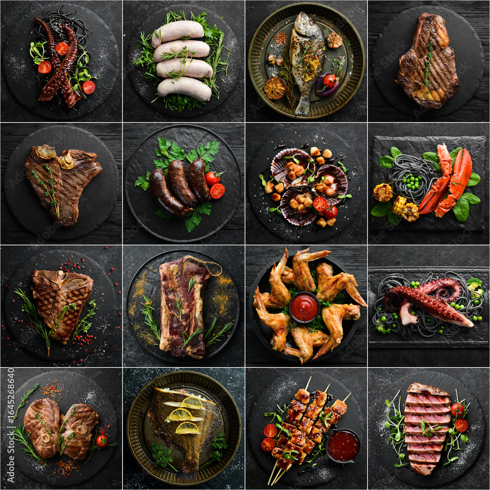 Food background. Set of meat, fish and seafood dishes. Top view. Photo collage.