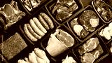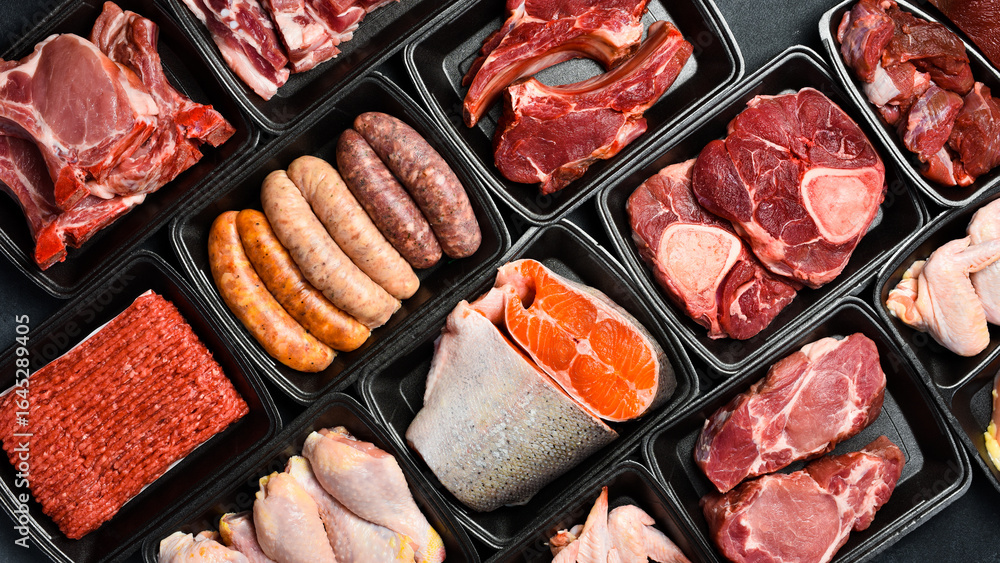 Black plastic packaging trays from supermarket with different types of fresh raw meat cuts, fresh beefbeef steaks, fish and variety meats in boxes from above