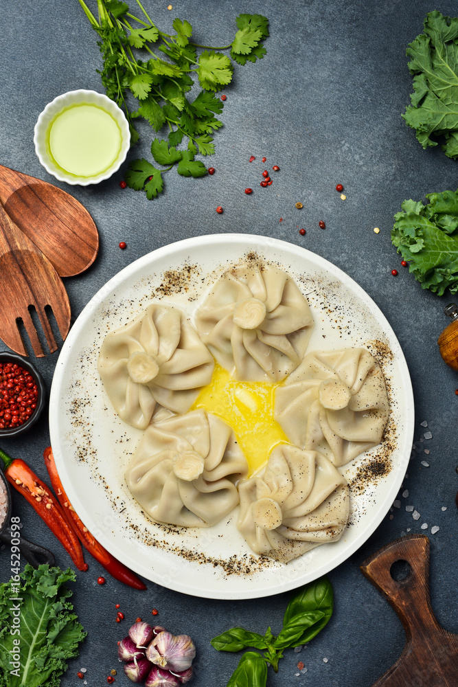 Boiled khinkali with lamb or beef or cheese. Traditional Georgian dish khinkali. Hinkali on a plate.