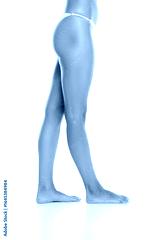 Studio shot of woman's legs and lower torso in white bikini, side view standing barefoot on white background.