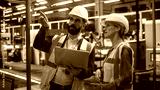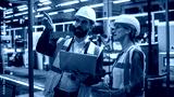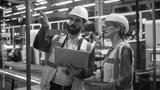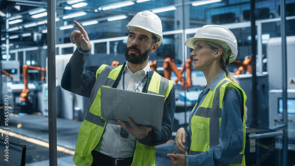 Portrait Of Hispanic Engineer Using Laptop Computer And Talking To Caucasian Female Designer At Autonomous Assembly Line With Robotic Arms. Colleagues Monitoring Machinery Production.