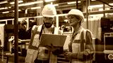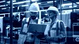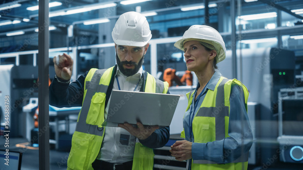 Portrait Of Hispanic Engineer Using Laptop Computer And Talking To Caucasian Female Designer At Autonomous Assembly Line With Robotic Arms. Colleagues Monitoring Machinery Production