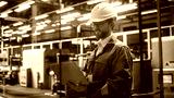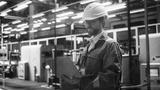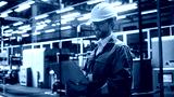 Factory Office: Portrait of Confident Caucasian Male Chief Engineer Wearing Hard Hat Working on Laptop Computer. Technician At Automated Robot Arm Assembly Line Manufacturing Electric Components.