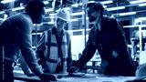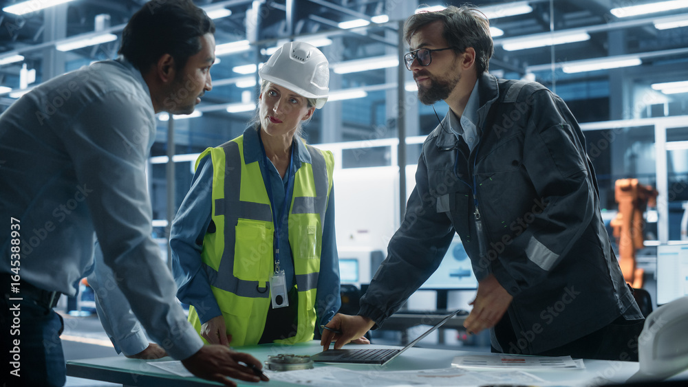 Electric Engine Autonomous Manufacturing Plant With Robotic Arms: Diverse Specialists Talking About Modern Machinery Production. Industrial Engineer, Designer, And Assembler Discussing Project.