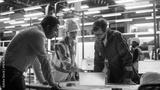 Autonomous Manufacturing Plant With Robotic Arms: Diverse Specialists Talking About Sustainable Energy Powered Jet Engine. Engineer, Designer, Quality Control Technician Discussing Innovative Project.