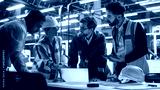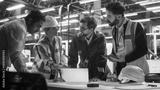 Meeting At Electronics Factory Office: Diverse Specialists Using Laptop And Tablet With Blueprints For Innovative Green Energy Engine. Facility With Autonomous Assembly Line With Robotic Arms.