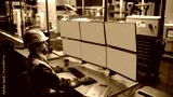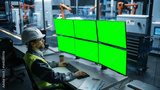Caucasian Male Autonomous Assembly Line Operator Using Multi Monitor Workstation With Green Screen Chromakey On Displays To Monitor And Control Production Of Modern Electronics With Robotic Arms.