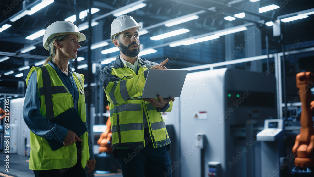 Portrait of Hispanic Male Process Engineer and Caucasian Female Production Supervisor Walking, Using Laptop, and Discussing Production at Industrial Machinery Manufacturing Plant with Robotic Arms.