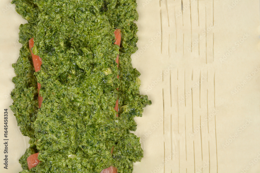 Salmon fillets topped with a generous layer of spinach mixture, placed on a sheet of puff pastry ready for baking