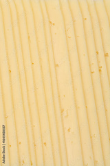 A close-up shot shows the texture of stacked cheese slices, creating vertical stripes