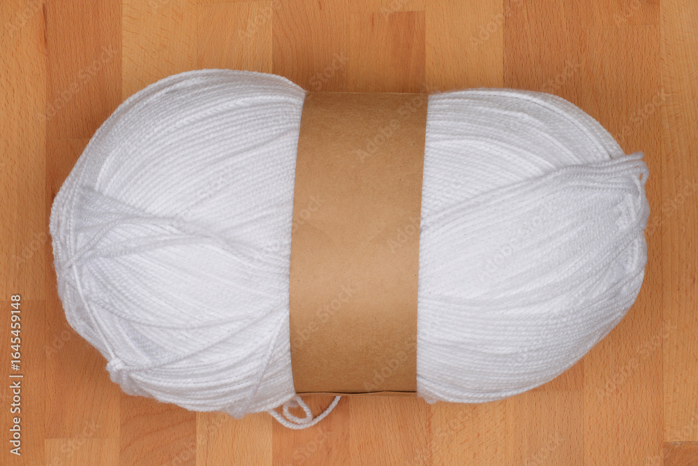 A single white skein of yarn with a brown paper band is lying on a textured wooden background, ready for crafting projects