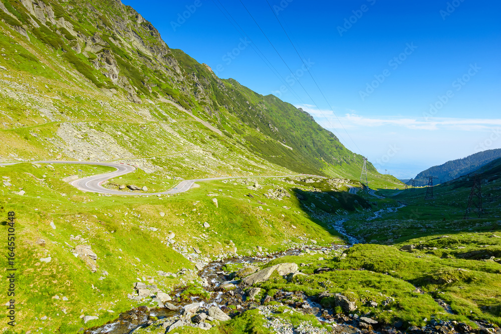 landscape with transfagarasan road in summer. travel romania. scenic view of valley with steep rocky hills and water stream on a sunny morning. alpine scenery of transylvania