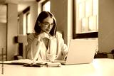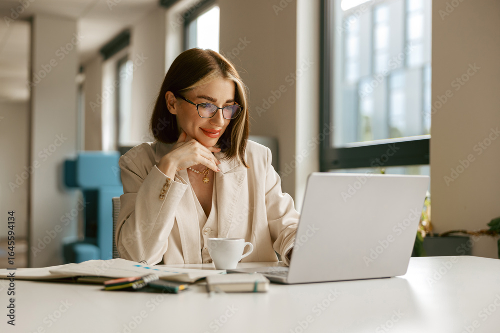 A very determined woman is seated in a stylish office, engrossed in her laptop while enjoying a warm cup of coffee
