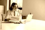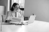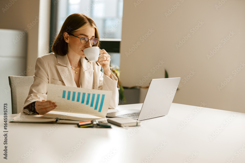 A skilled professional woman analyzing charts on her laptop in a bright, inviting office environment