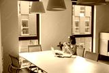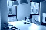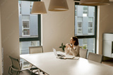 A woman is calmly and thoughtfully enjoying a delicious beverage while seated in a contemporary office environment