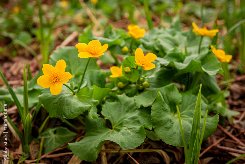 Blooming marsh marigold flowers caltha palustris in spring | Kwitnące kwiaty kaczeńca błotnego/ knieci błotnej (Caltha palustris) wiosną