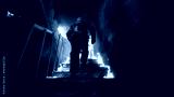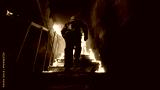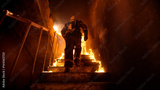 Strong and brave Firefighter Going Up The Stairs in Burning Building. Stairs Burn With Open Flames.