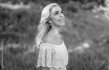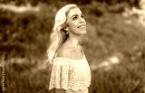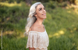 A woman with long grey hair smiles peacefully while enjoying the serene outdoors in a sunny park setting. Her expression reflects contentment and appreciation of nature's beauty.