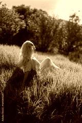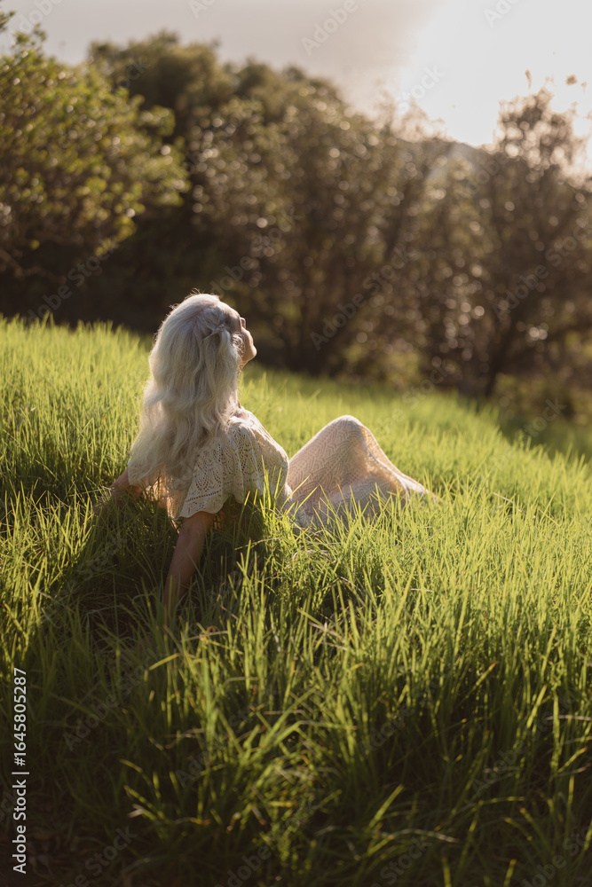 A peaceful scene with a woman enjoying the tranquility of a green field during the golden hour. The serene atmosphere captures the essence of relaxation and connection with nature.