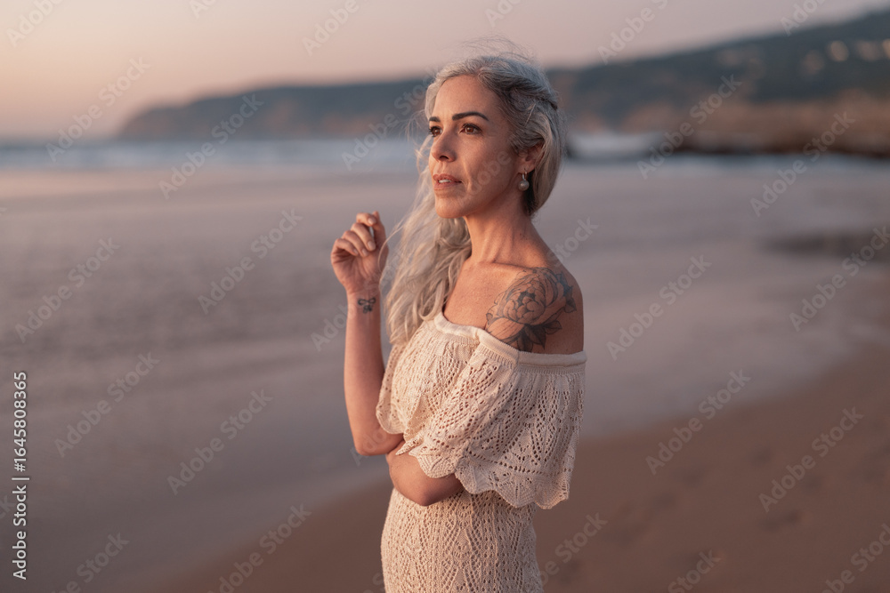 A mature woman with a tattoo stands pensively on a serene beach at sunset. The tranquil scenery and her thoughtful expression create a peaceful and reflective atmosphere.
