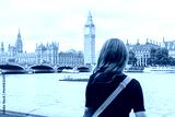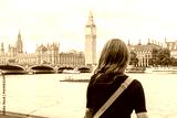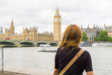Tourist woman admiring Big Ben and Houses of Parliament from River Thames in London