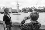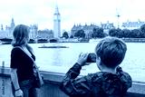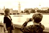 Young boy photographing his mother with Big Ben and Houses of Parliament in the background.