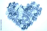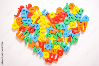 Learning and love for literature, poetry or knowledge concept. Positive educational communication. Colorful alphabet letters arranged in shape of heart on white background. English grammar teaching.