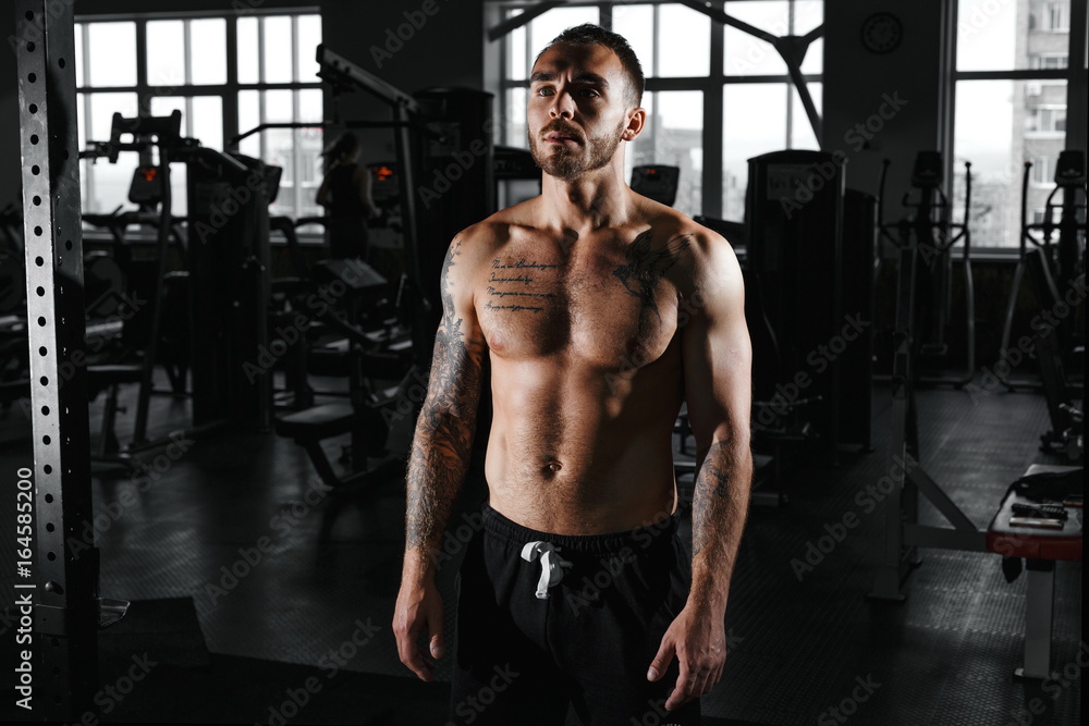 Handsome Young Man Standing Strong In The Gym And Flexing Muscles - Muscular Athletic Bodybuilder Fitness Model Posing After Exercises