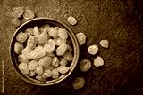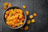 Bowl with dried golden raisins, on a stone background.