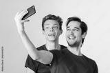 Two happy friends taking selfie on mobile phone camera