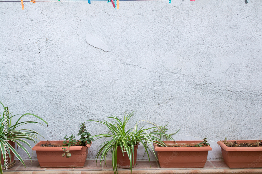Fondo de pared blanca de casa de pueblo con macetas con plantas. Mock Up