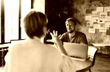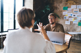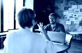 Smiling freelancer engaged in digital discussion while partner gestures expressively, symbolizing emotional UX, collaborative spirit, and interface design in creative tech-based workspace.