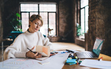 Woman in white sweater flipping sketchbook pages while analyzing UX layout drafts and planning user interface design in rustic studio filled with design tools and soft daylight.