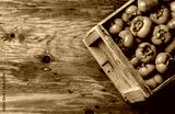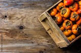 Box of fresh fruits persimmon kaki on wooden background. Copy space